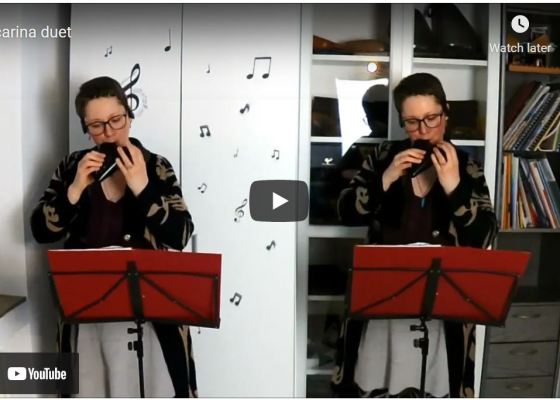 The talented Linkette Puschellord plays one of my pieces, a duet, on a double-chambered ocarina. The piece she’s playing is